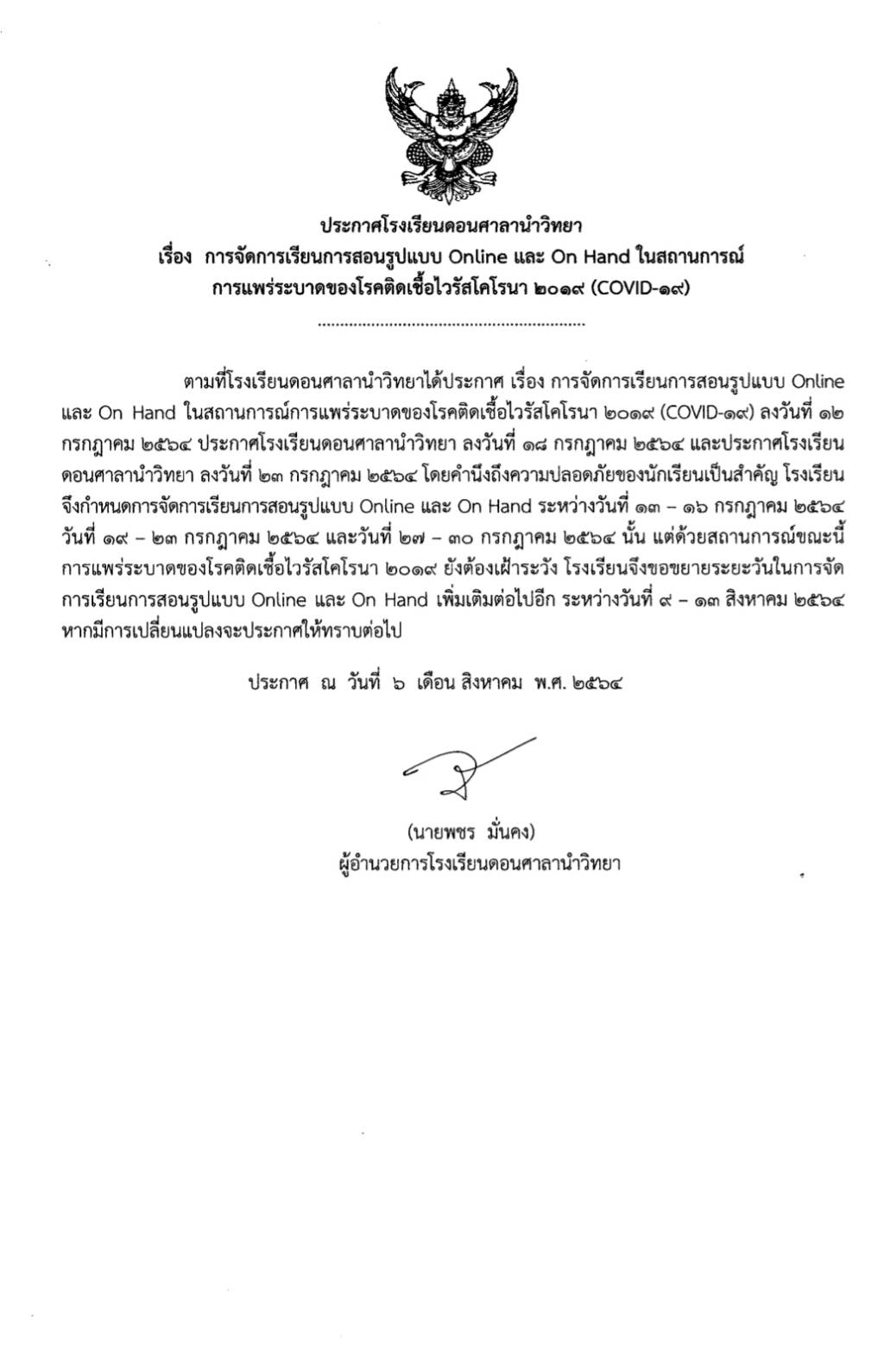 ประกาศโรงเรียนดอนศาลานำวิทยา เรื่อง การจัดการเรียนการสอนรูปแบบ Online และ On Hand ในสถานการณ์การแพร่ระบาดของโรคติดเชื้อไวรัสโคโรนา 2019 (COVID-19) ระหว่างวันที่ 9 - 13 สิงหาคม 2564