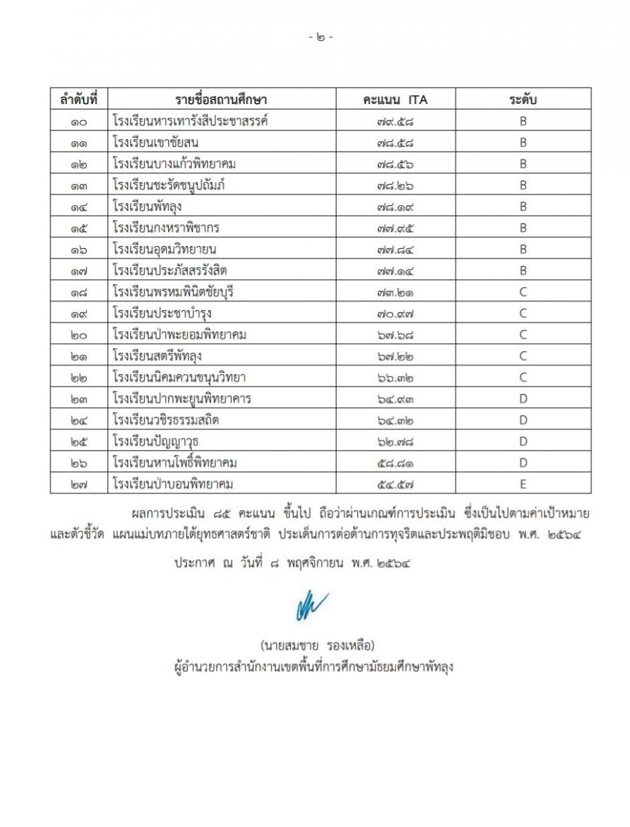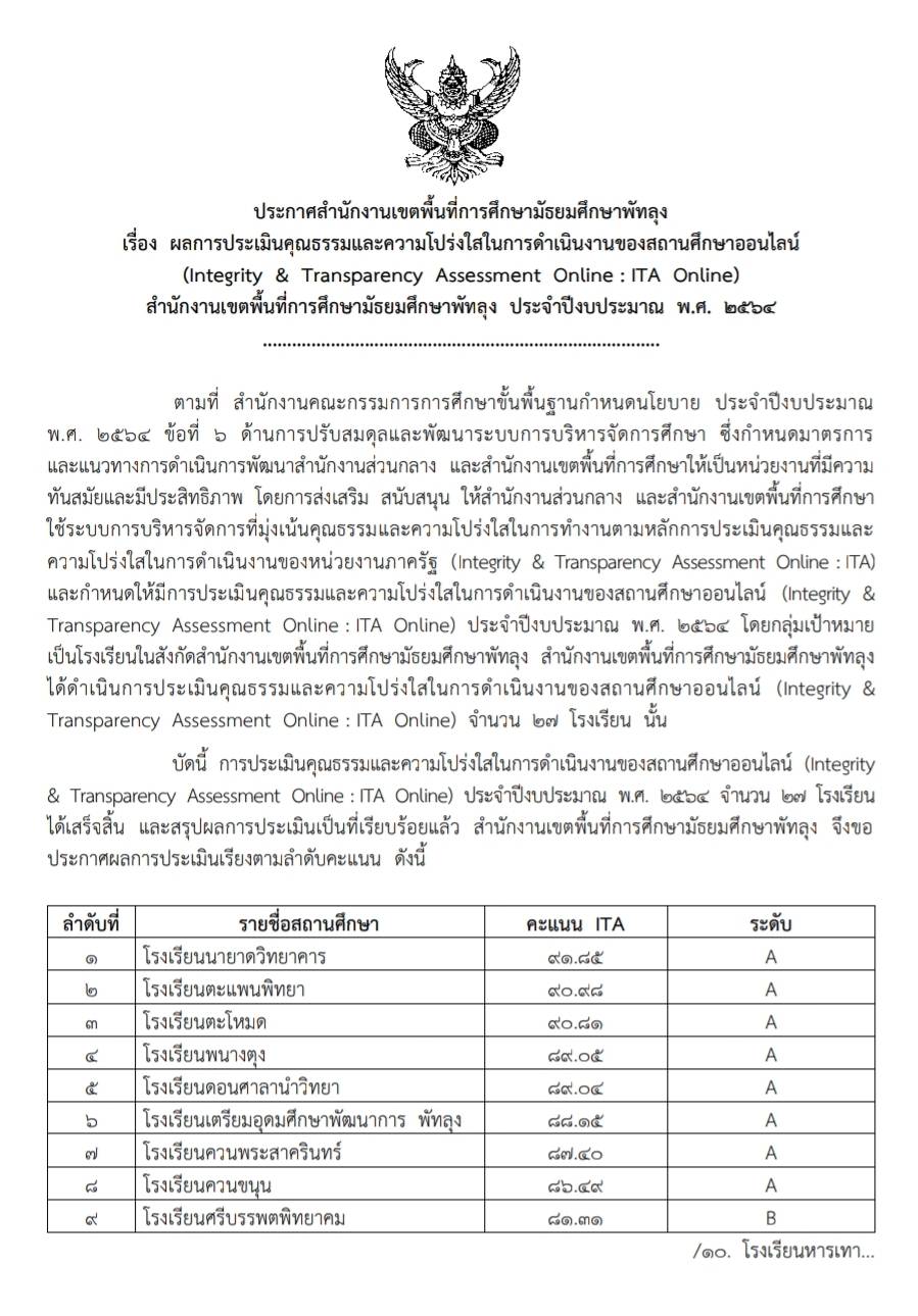 ผลการประเมินคุณธรรมและความโปร่งใสในการดำเนินงานของสถานศึกษาออนไลน์ ประจำปีงบประมาณ 2564