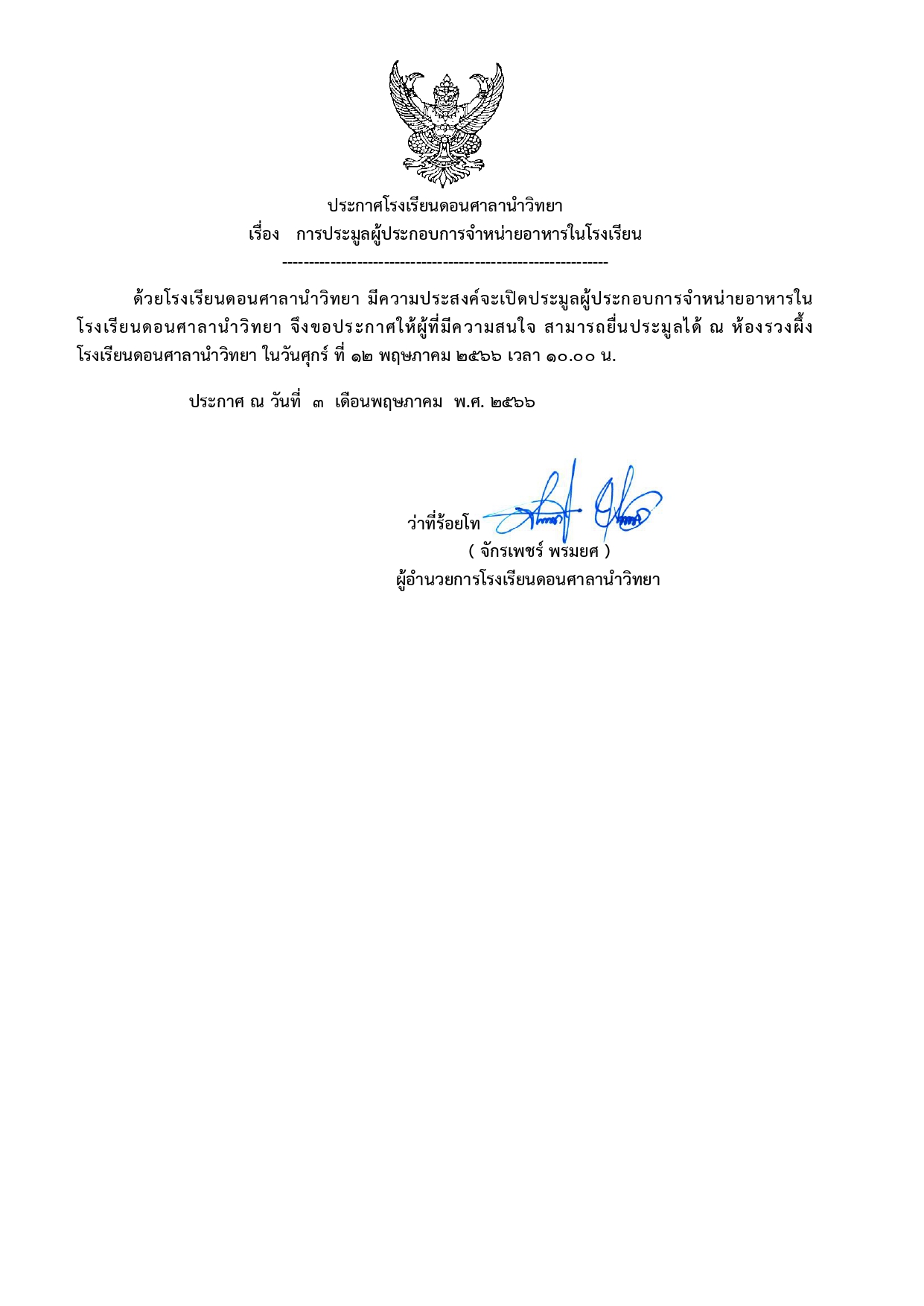 ประกาศโรงเรียนดอนศาลานำวิทยา เรื่อง การประมูลผู้ประกอบการจำหน่ายอาหารในโรงเรียน