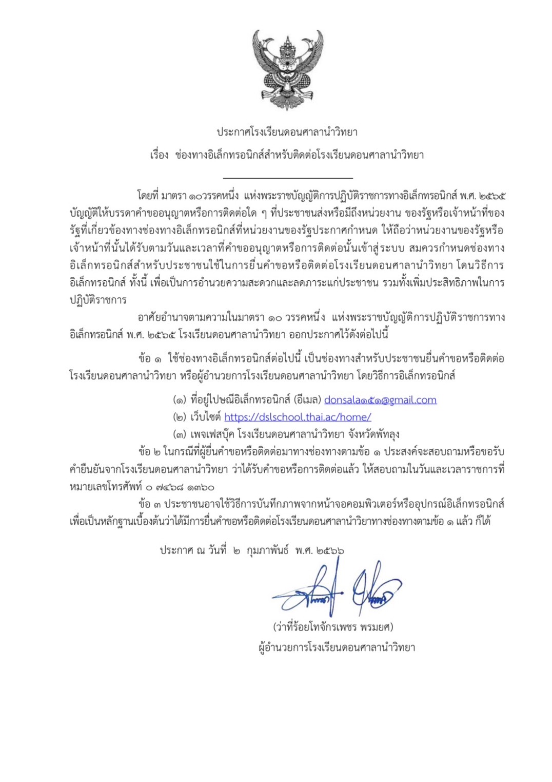ประกาศ เรื่อง ช่องทางอิเล็กทรอนิกส์สำหรับติดต่อโรงเรียนดอนศาลานำวิทยา